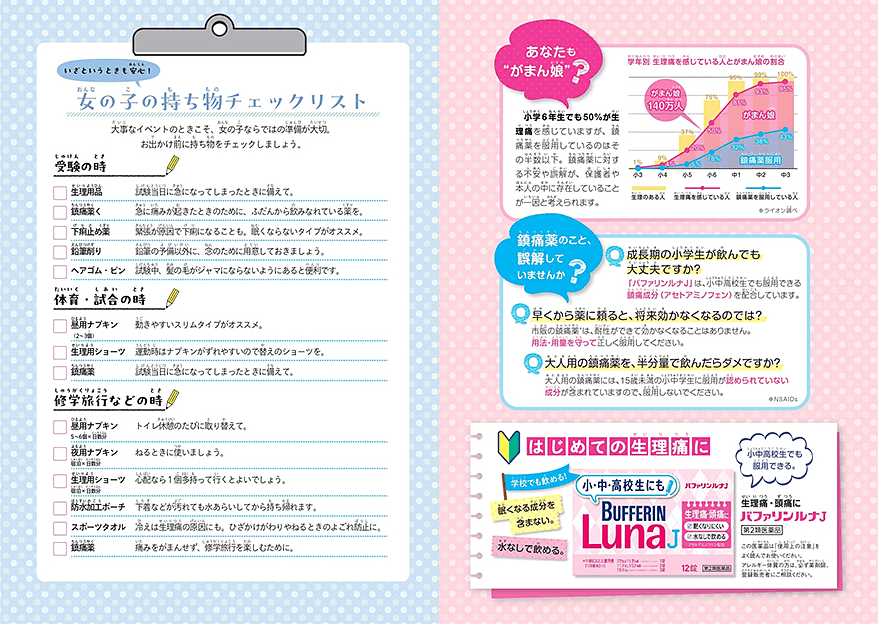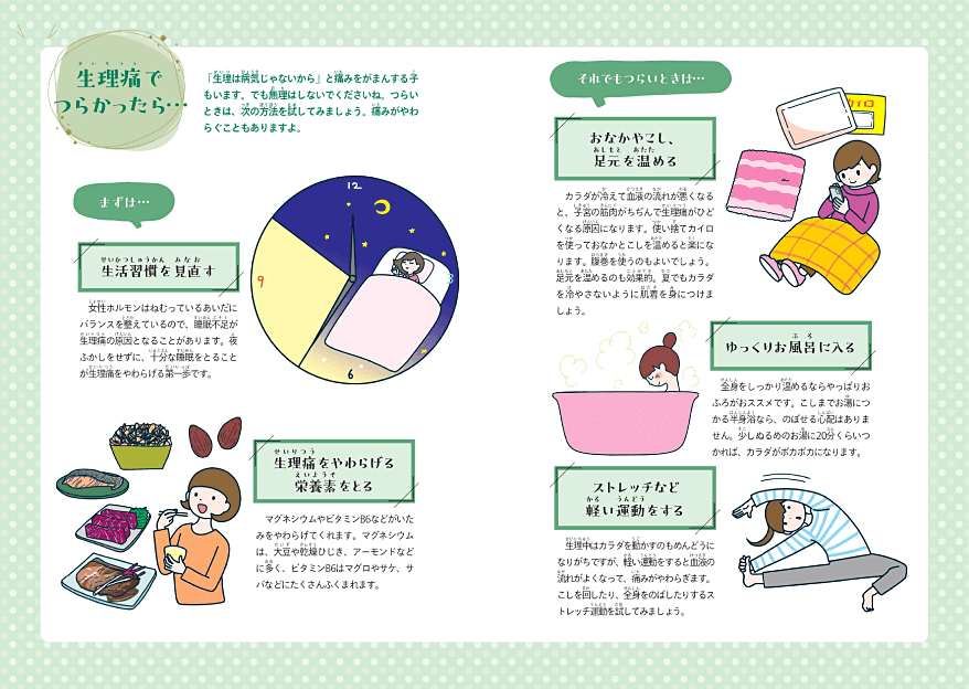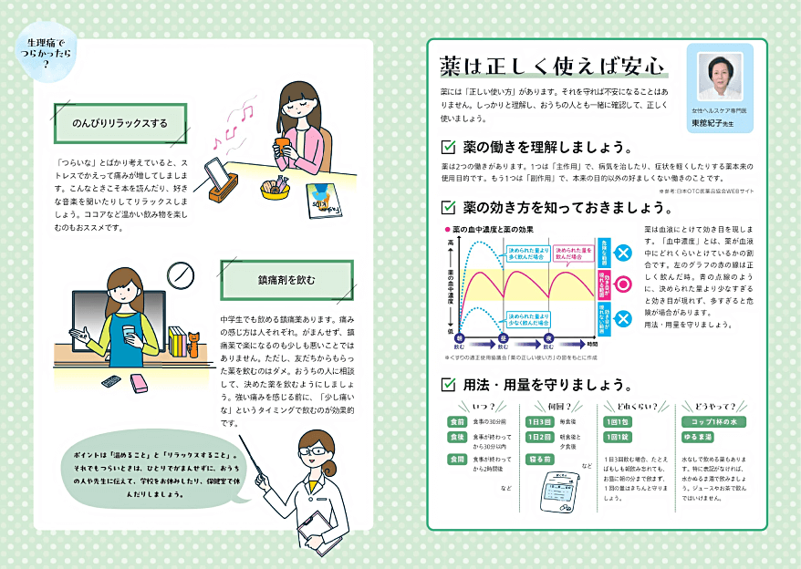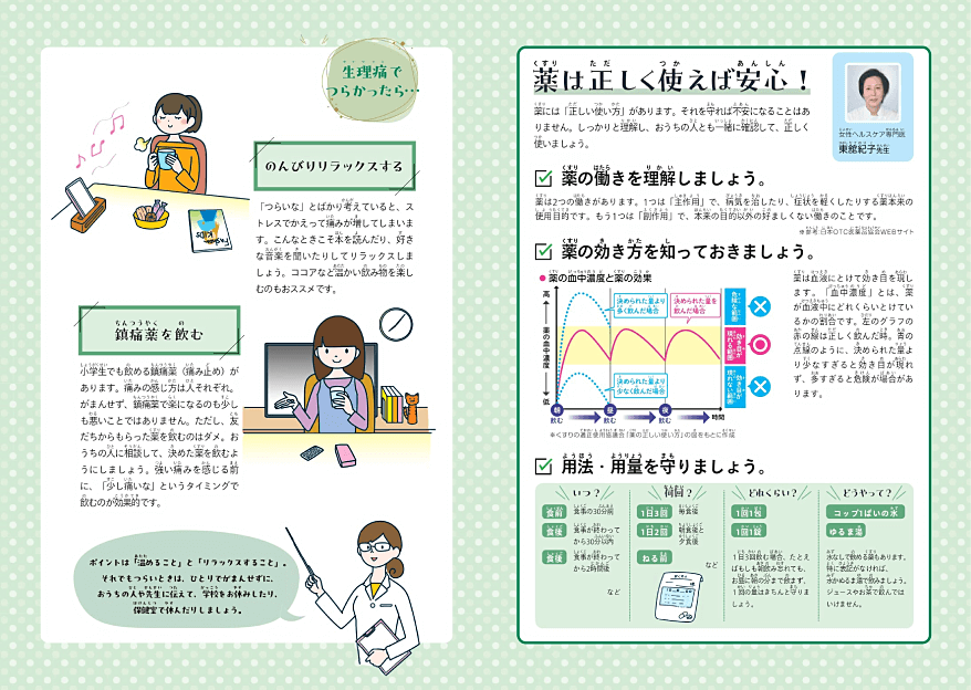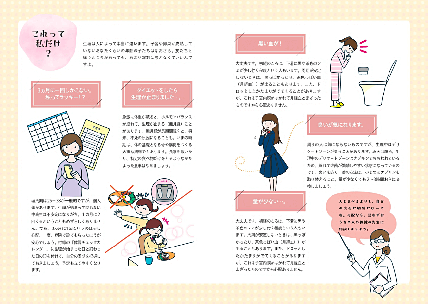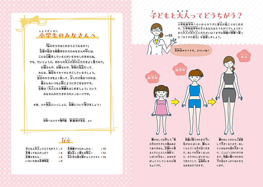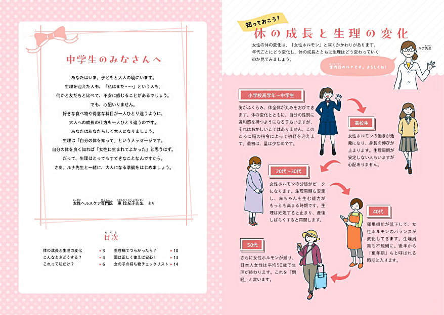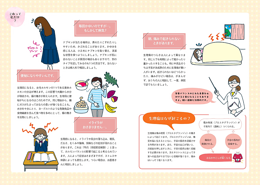 これから初潮を迎えるお子さんに向け、小学生高学年あたりから始まるカラダの変化をわかりやすく解説。生理中の過ごし方やよくある悩み、薬の使い方についてもアドバイスしています。
