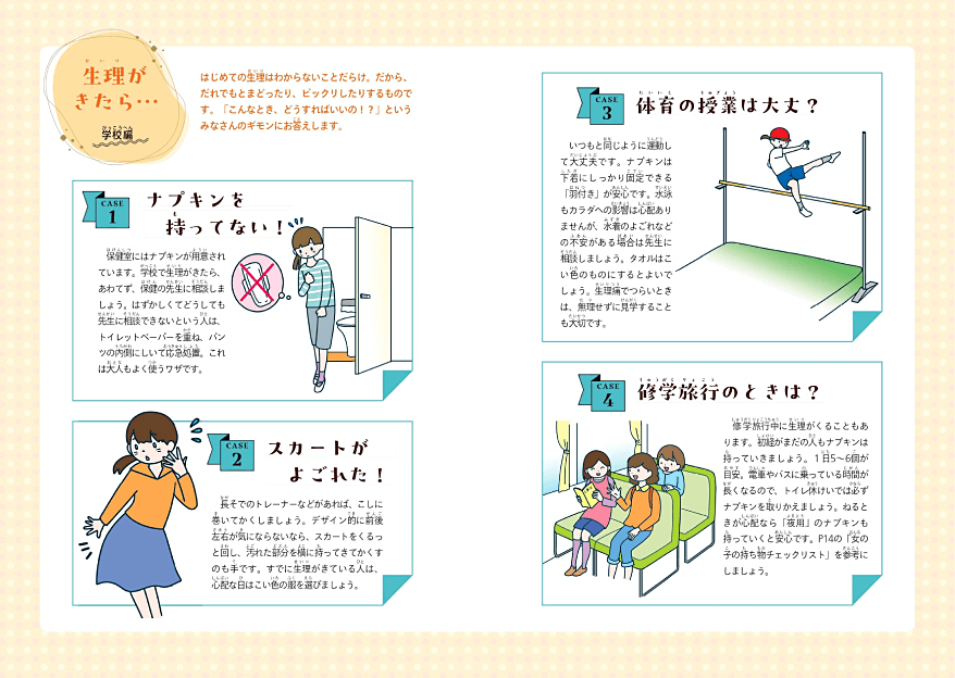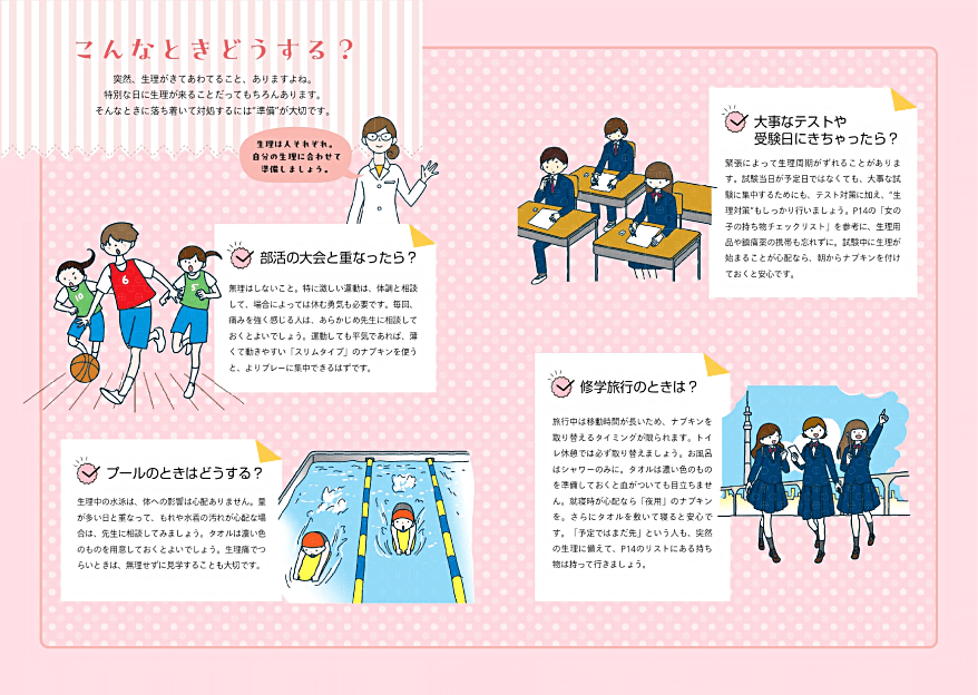 ココロもカラダも大きく成長する中学生向けに。勉強や部活動など、忙しい学生生活の中で直面するであろう生理への不安や疑問にお答え。生理痛の対処法などもアドバイスしています。